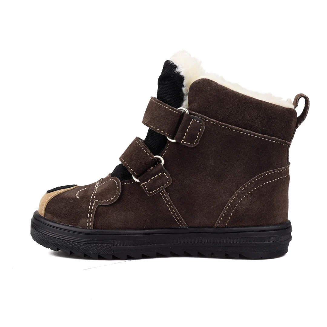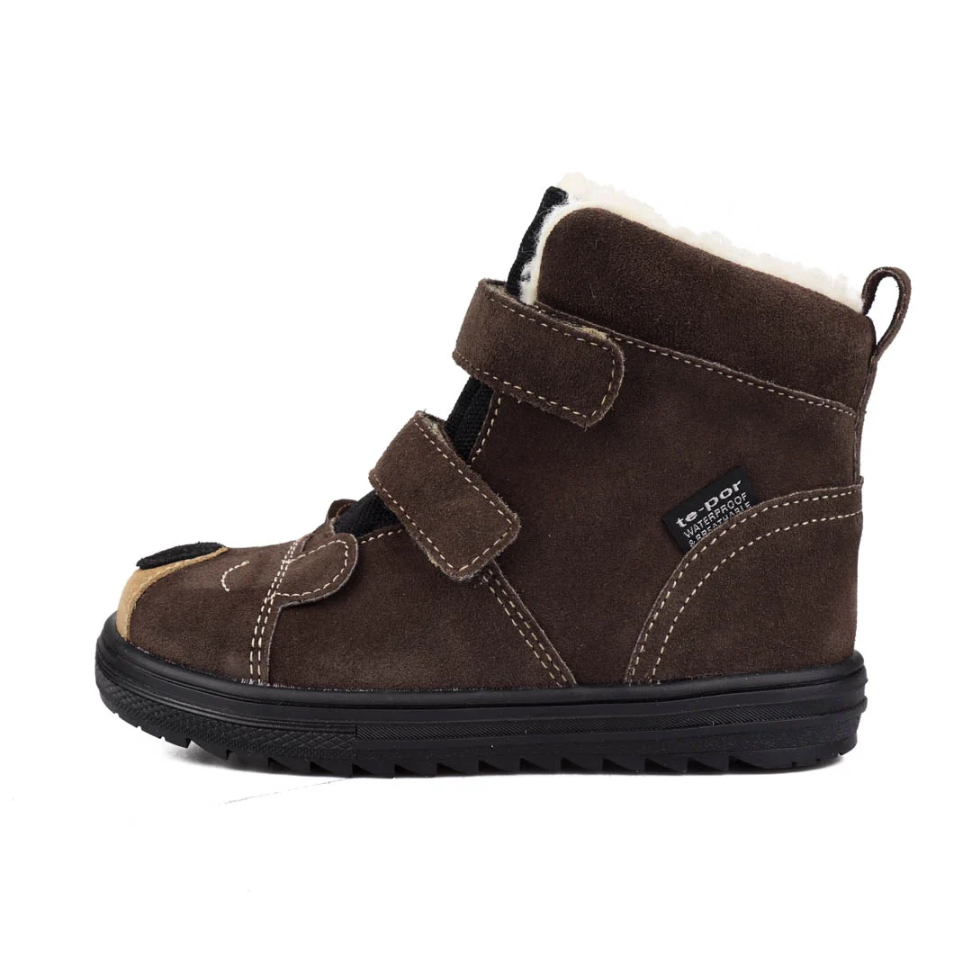Trzewiki wodoodporne z membraną te-por. Wykonane z wysokojakościowej skóry naturalnej-welurowej. Trzewiki zapinane są na rzepy. Komfortowa i ocieplana wkładka z warstwą termoizolacyjną. Dzięki usztywnianej pięcie i elastycznej podeszwie, wspierają prawidłowy rozwój stopy.